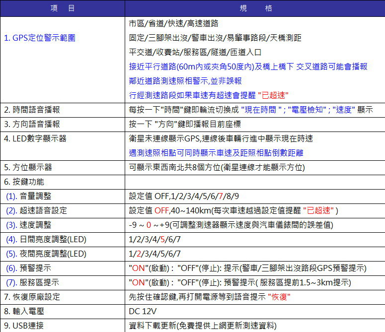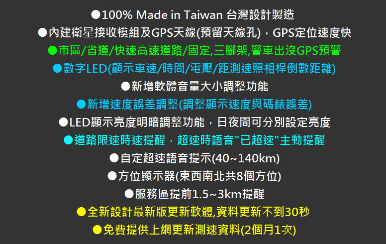 產品內含: 測速器主機 外接GPS衛星天線 網路下載傳輸線 車內專用電源線 防滑墊 中文安裝使用說明書 |
